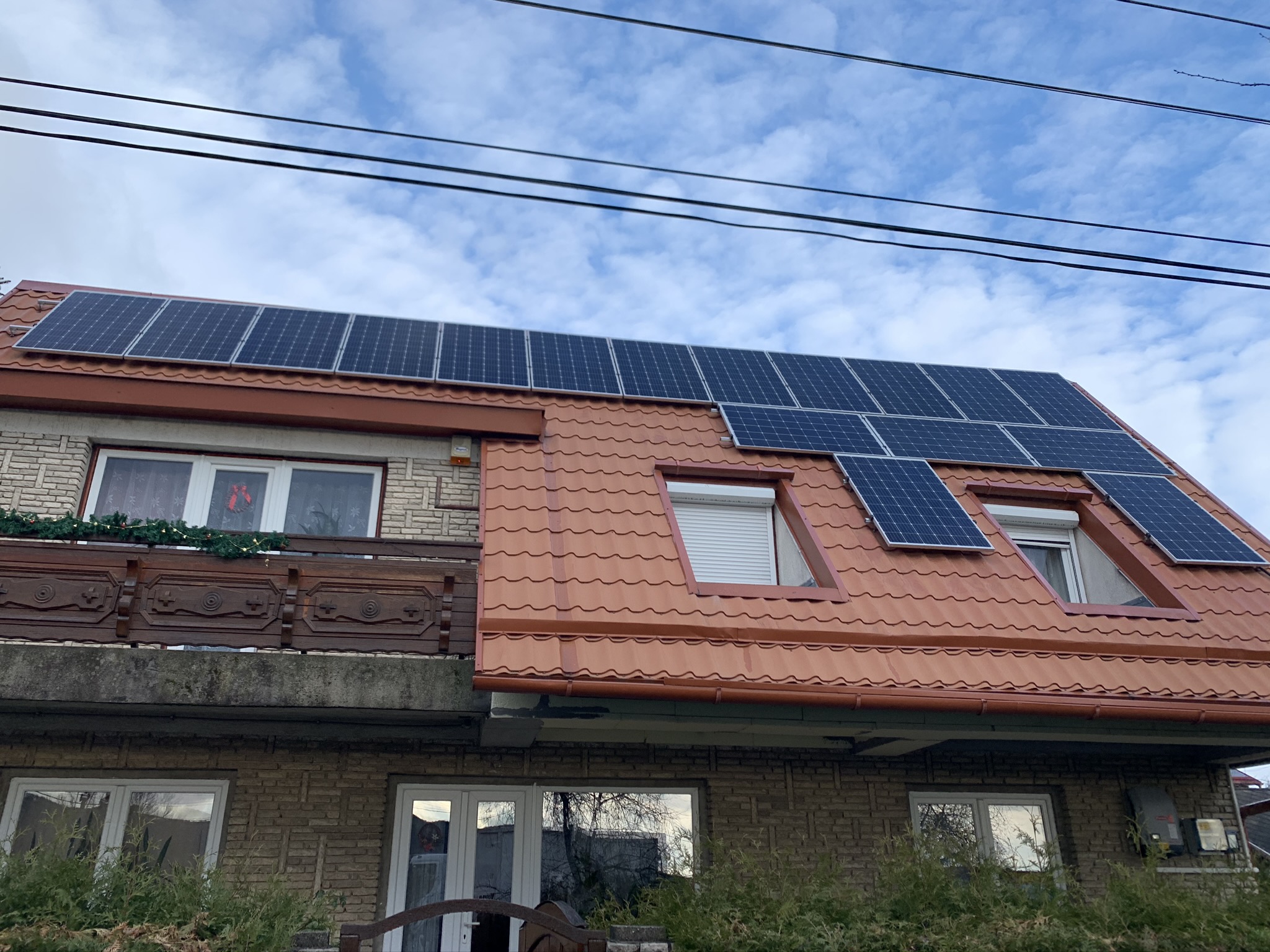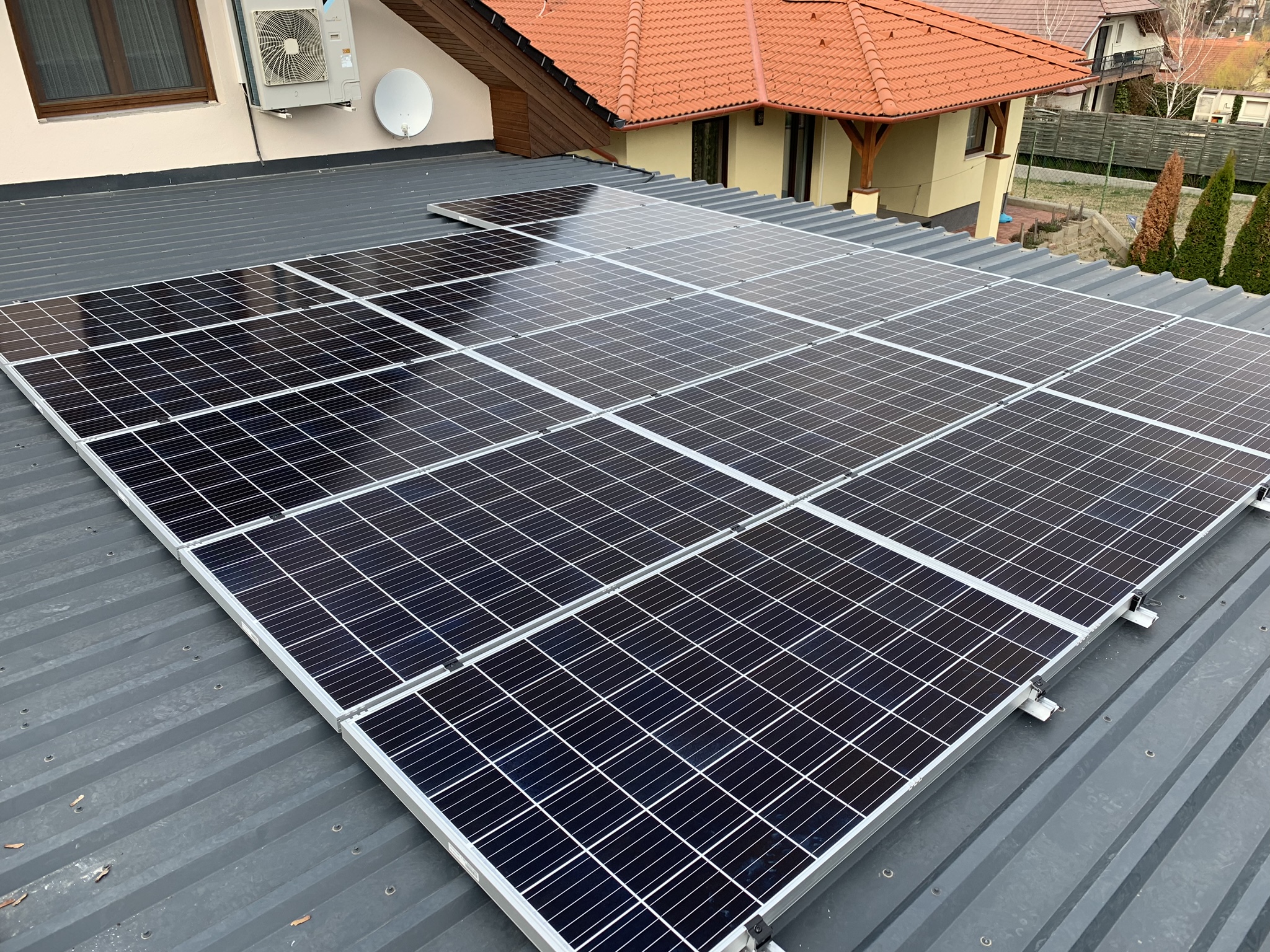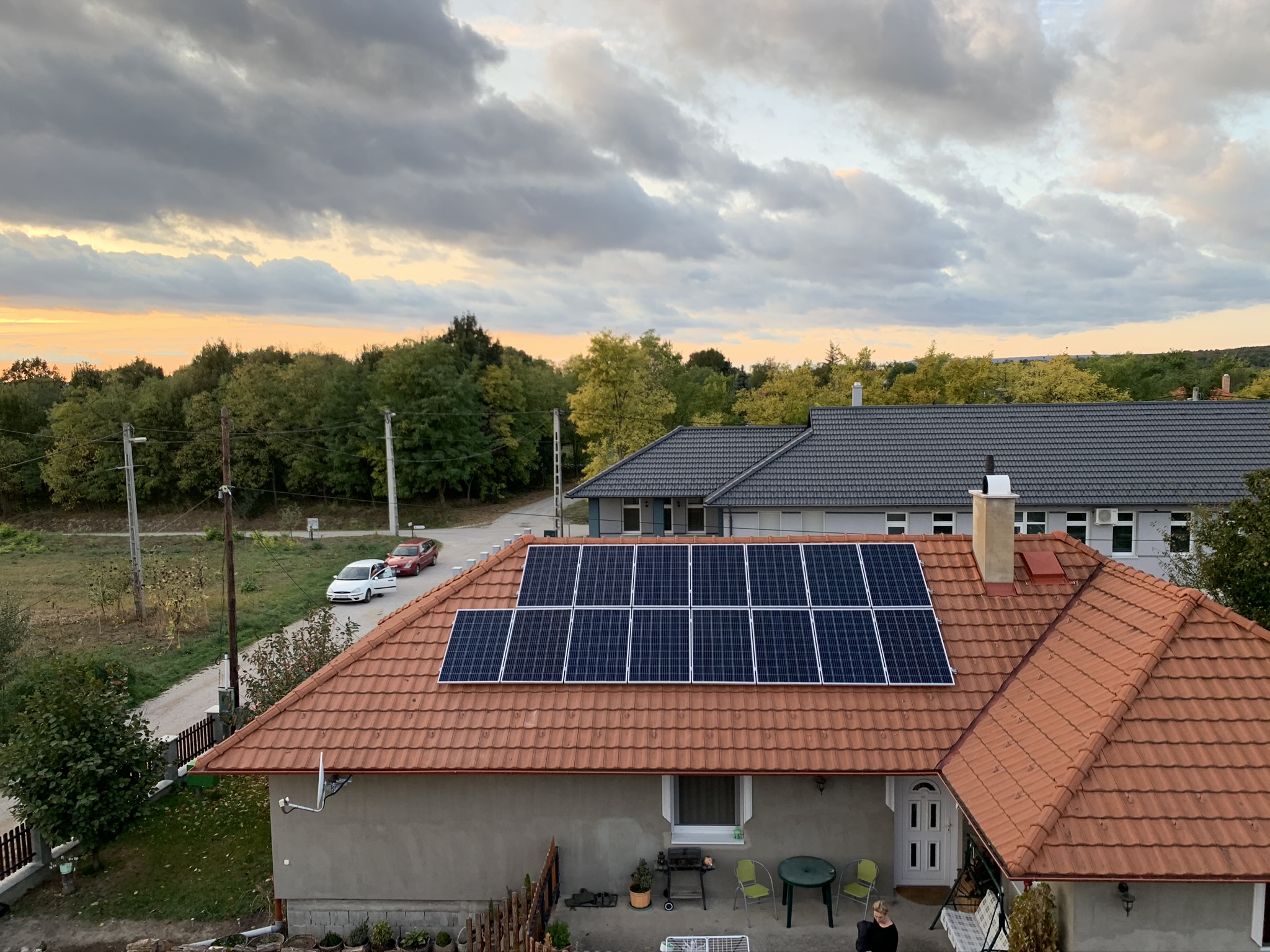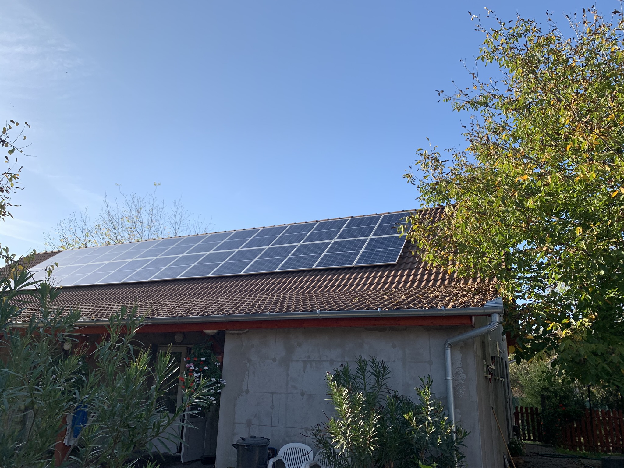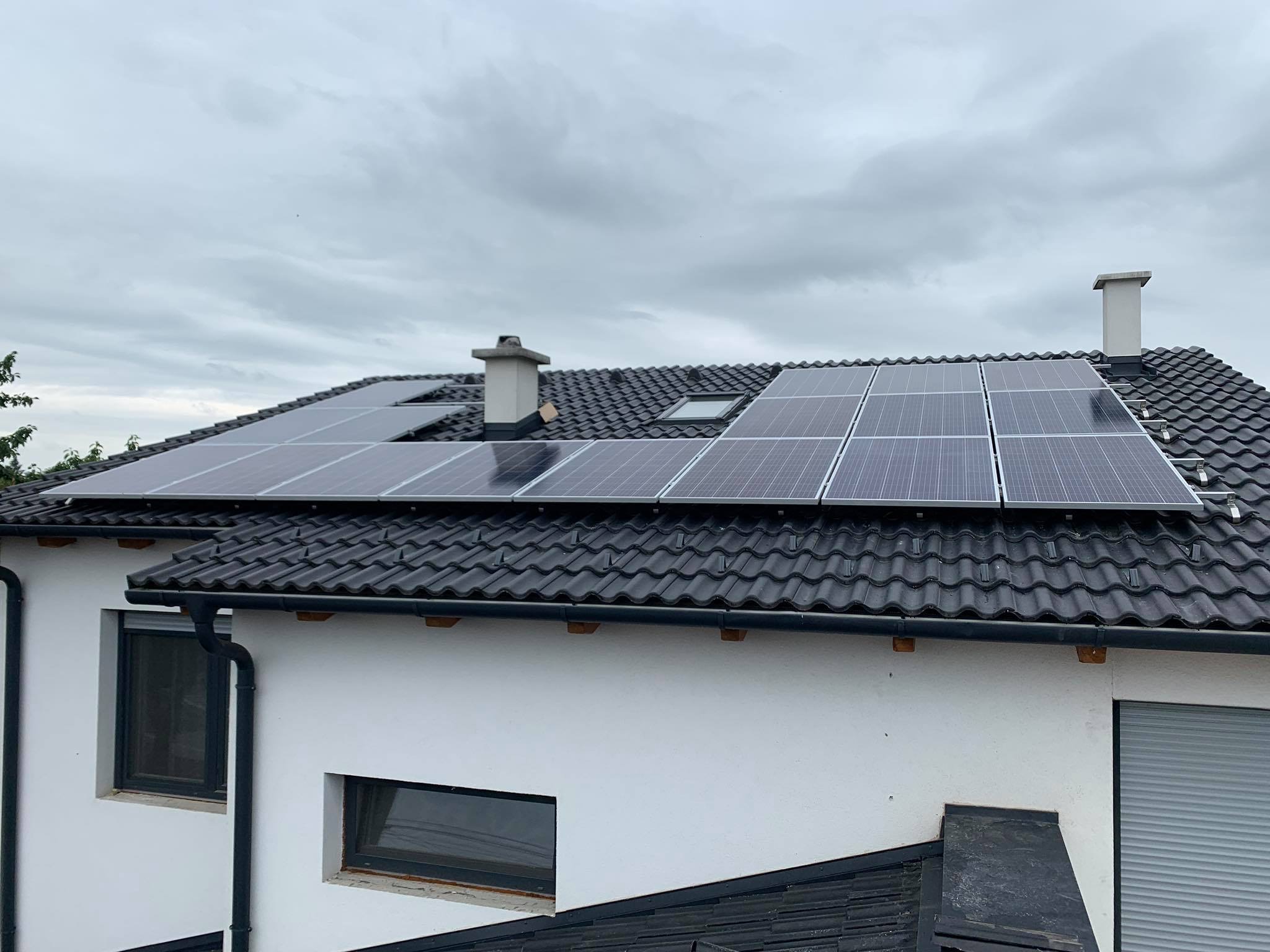 A családi házra telepített 56 paneles napelemes rendszer 20 kW inverterrel készült, modern, energiahatékony megoldást biztosítva a mindennapi fogyasztás fedezésére.