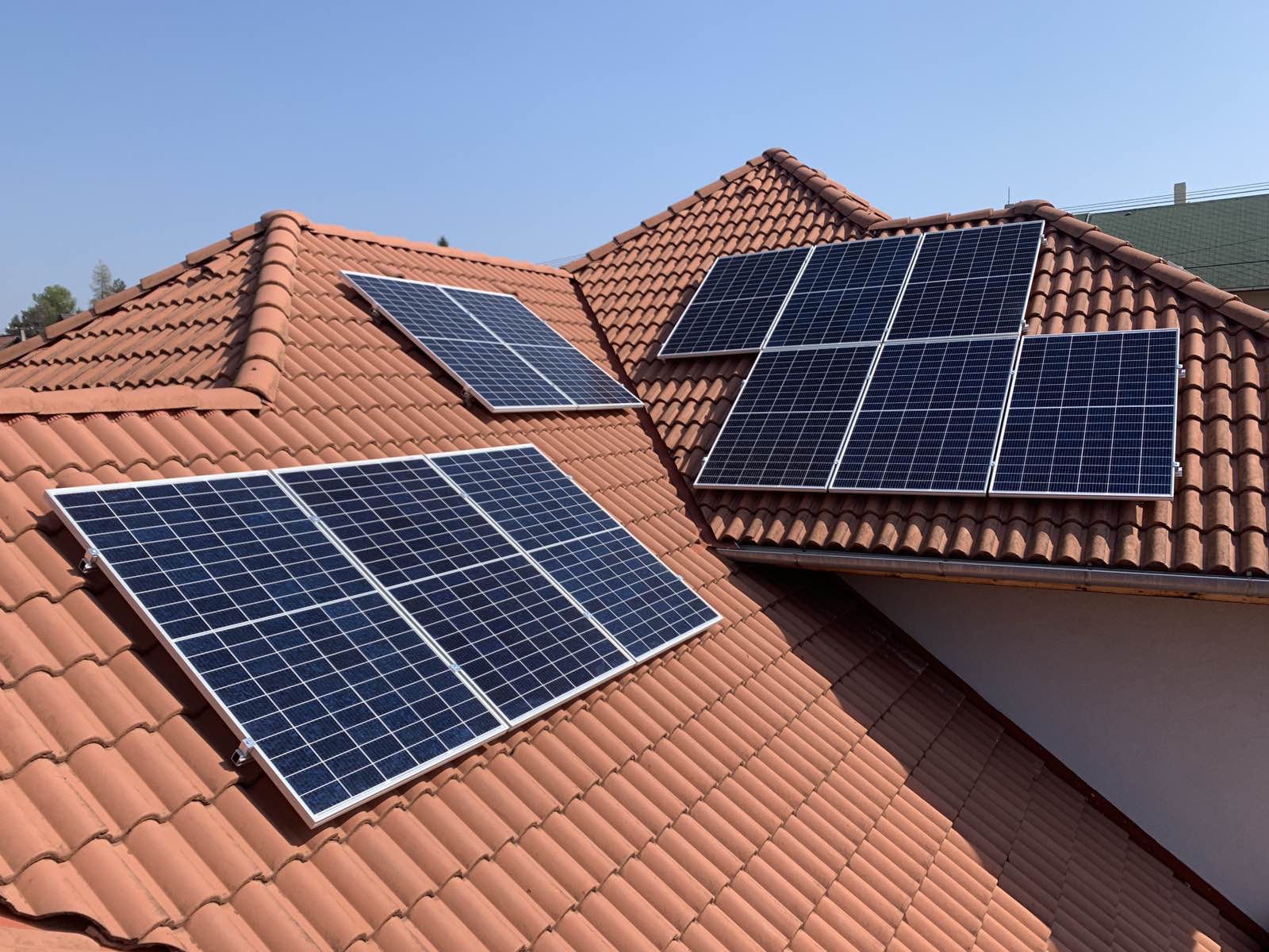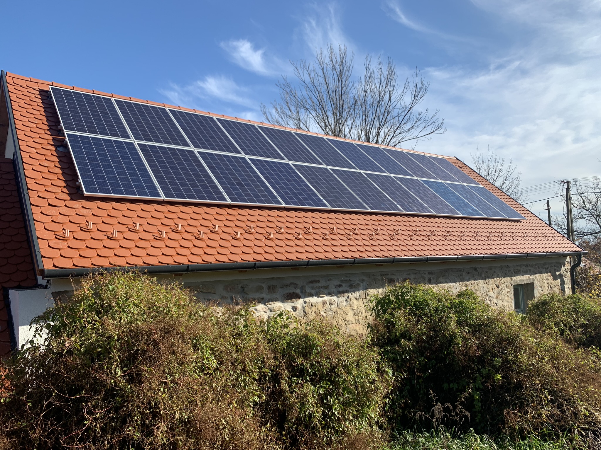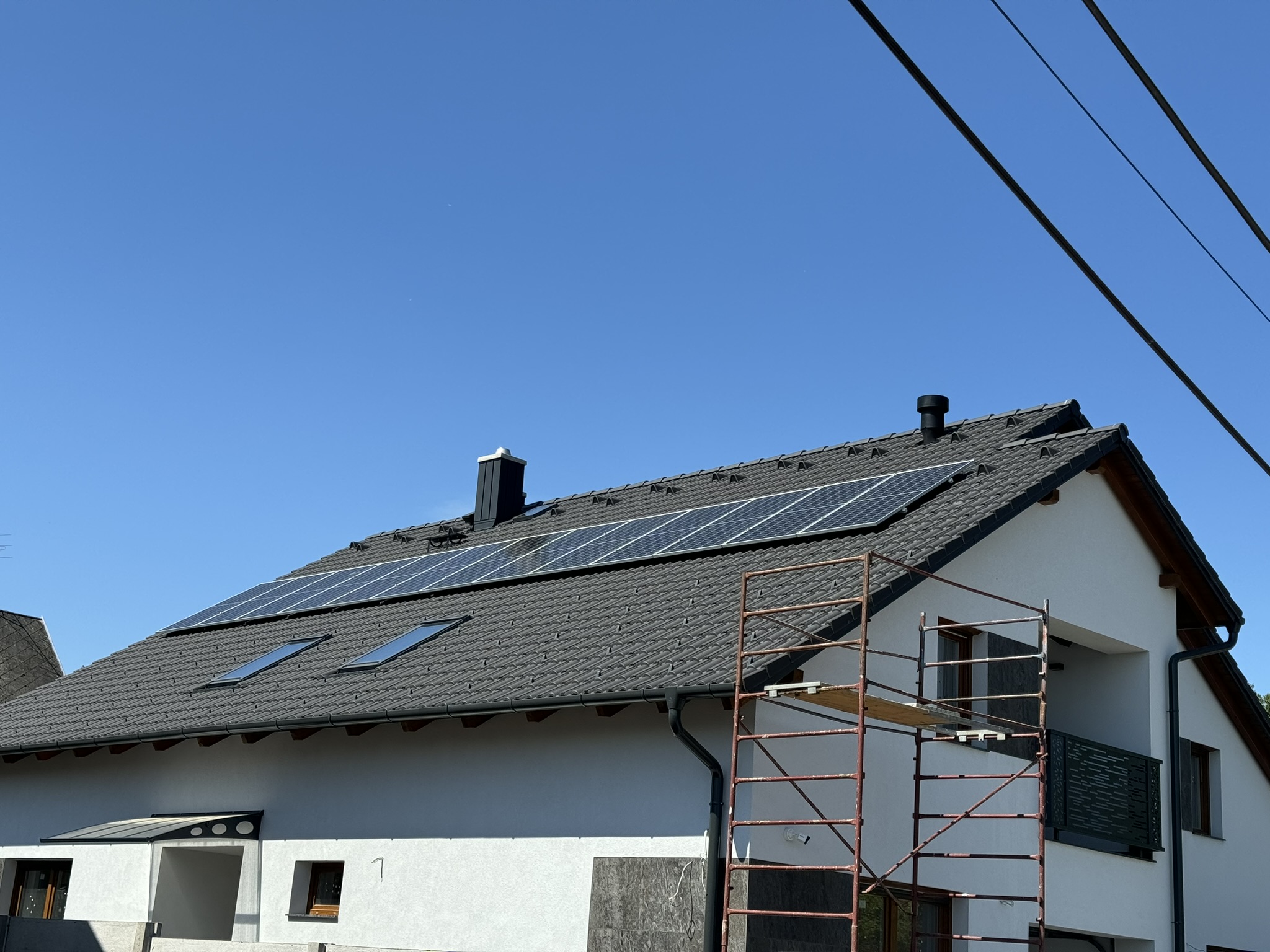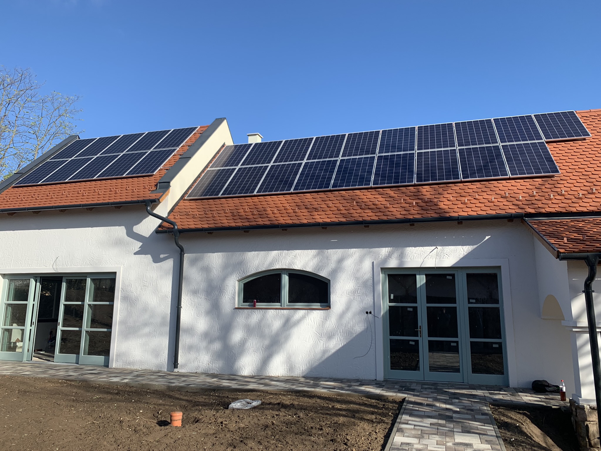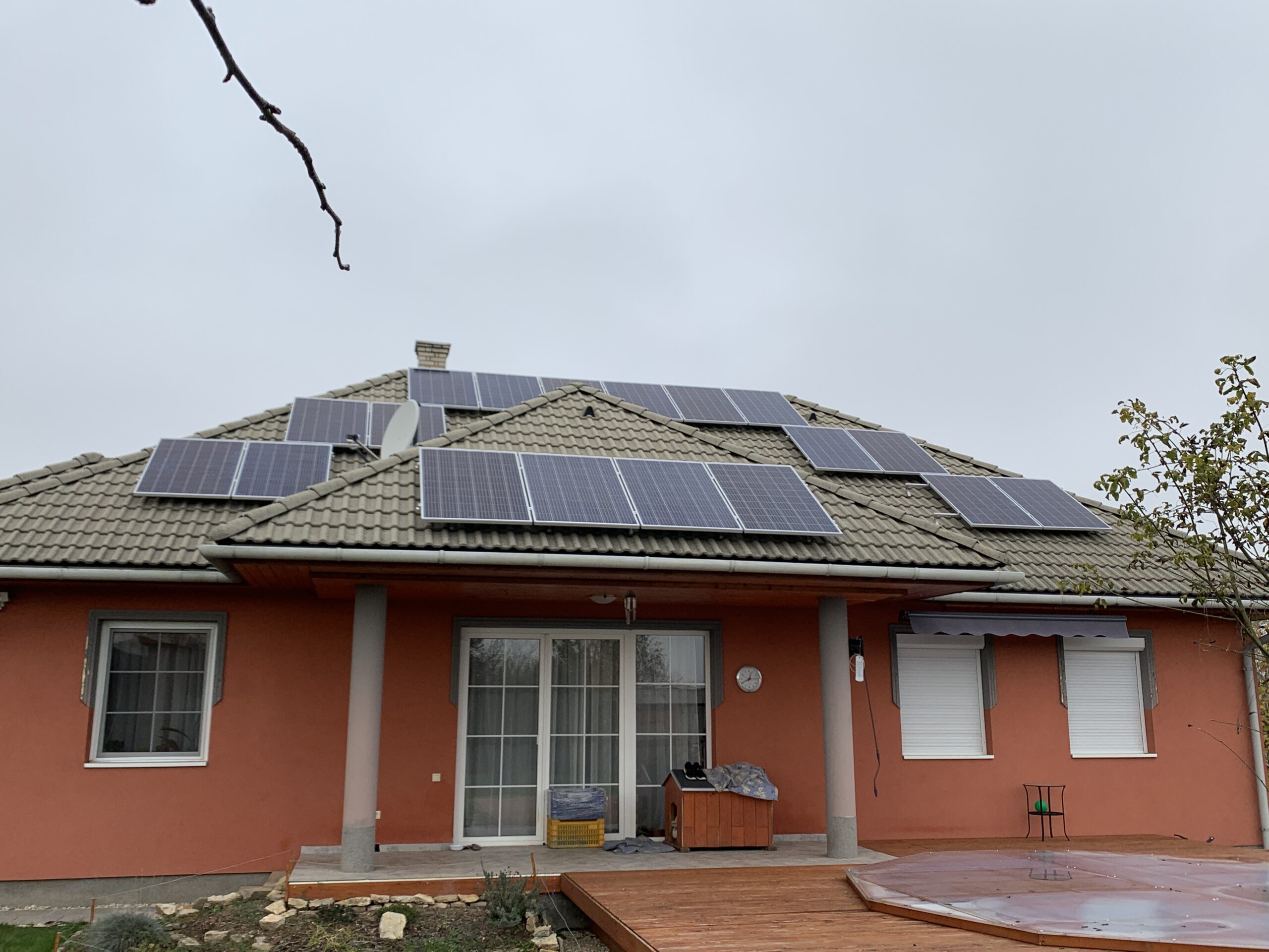 A családi házra telepített 56 paneles napelemes rendszer 20 kW inverterrel készült, modern, energiahatékony megoldást biztosítva a mindennapi fogyasztás fedezésére.