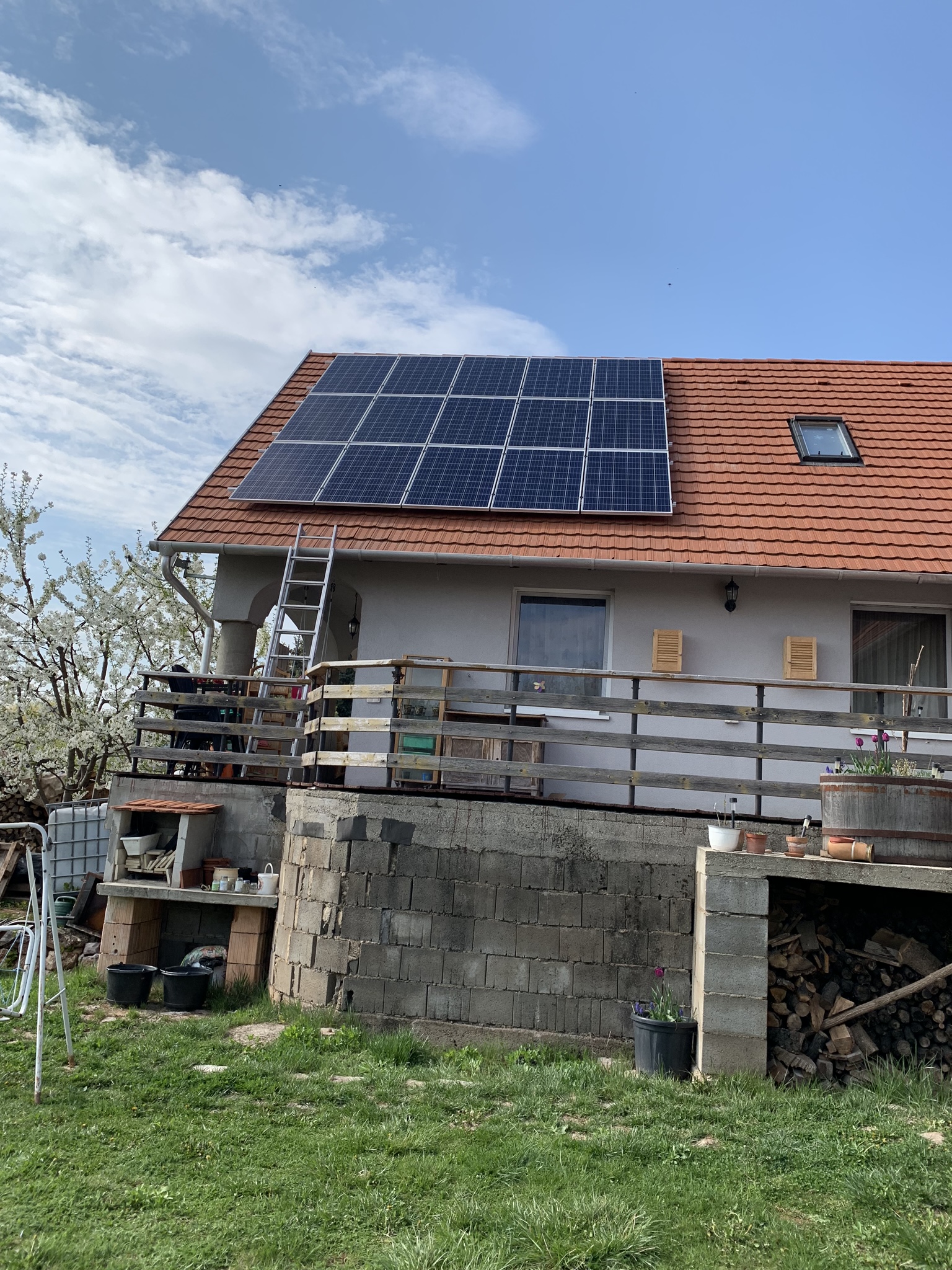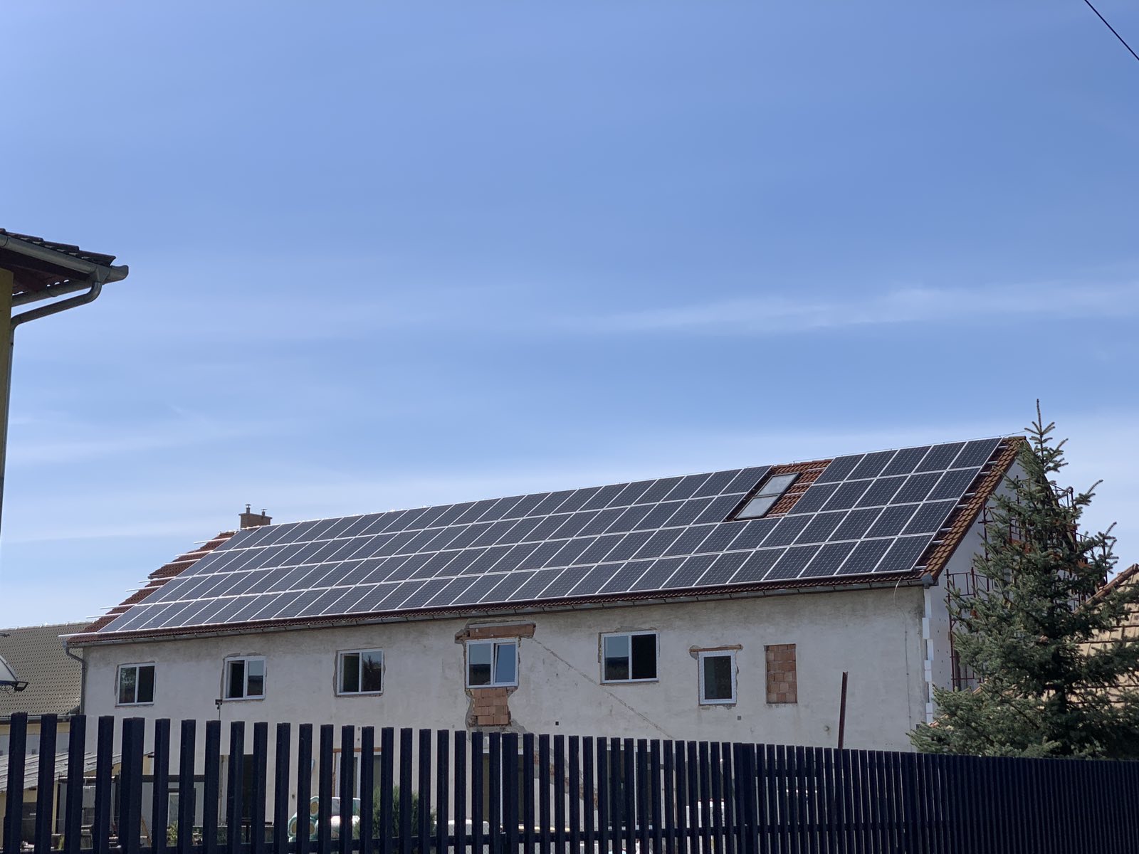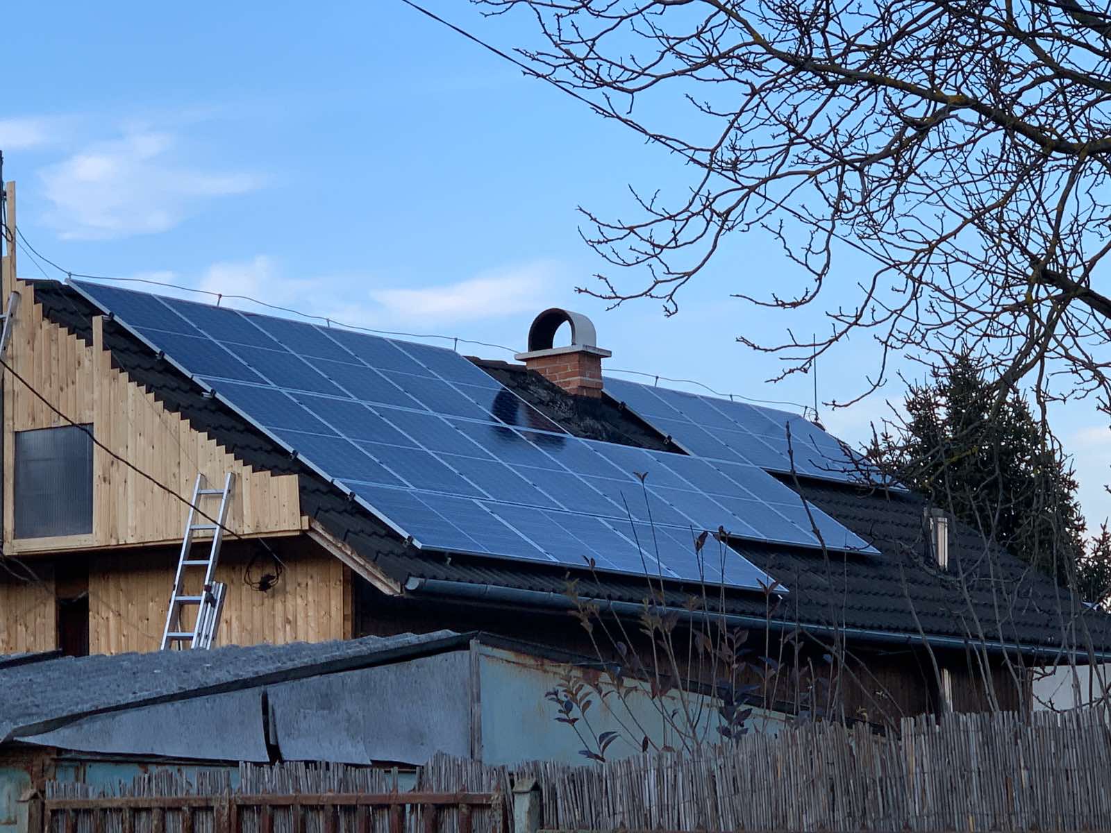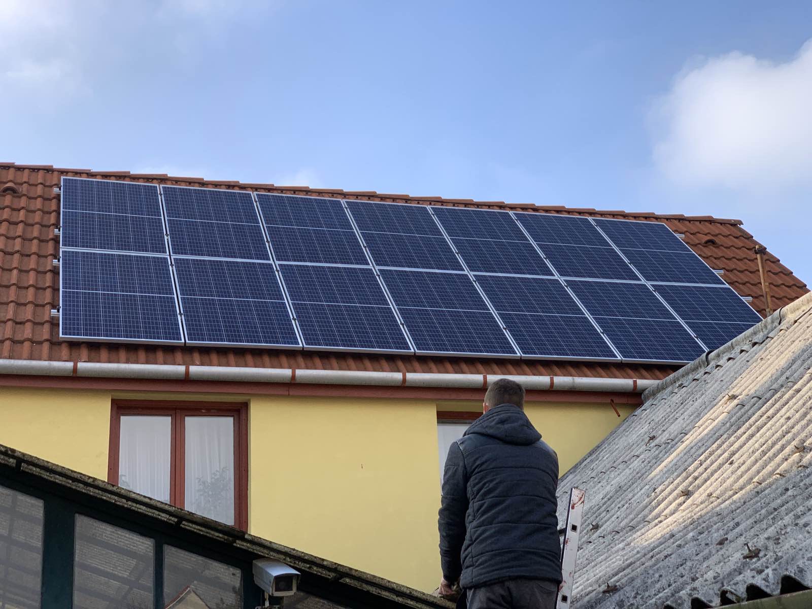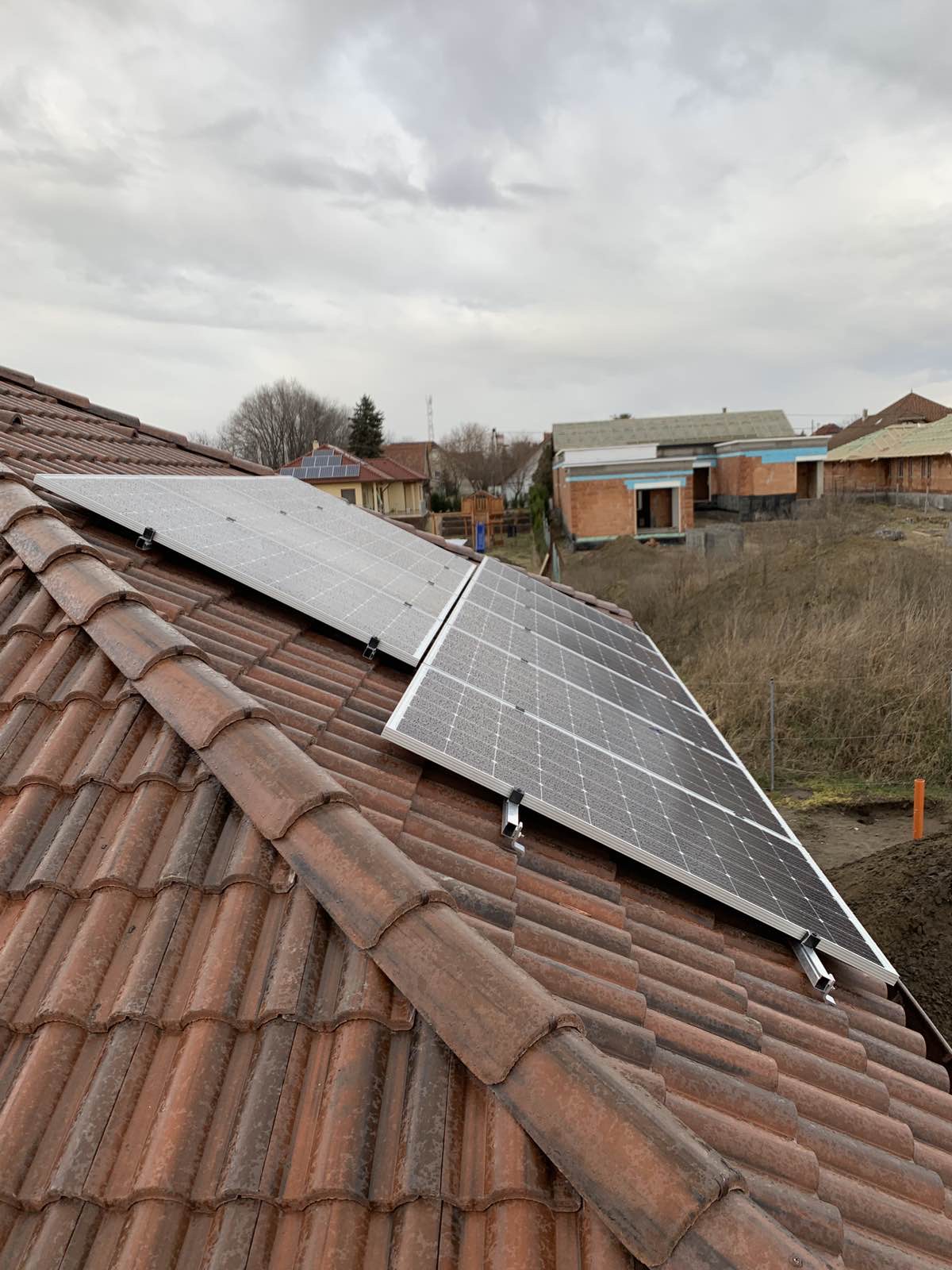 A családi házra telepített 56 paneles napelemes rendszer 20 kW inverterrel készült, modern, energiahatékony megoldást biztosítva a mindennapi fogyasztás fedezésére.