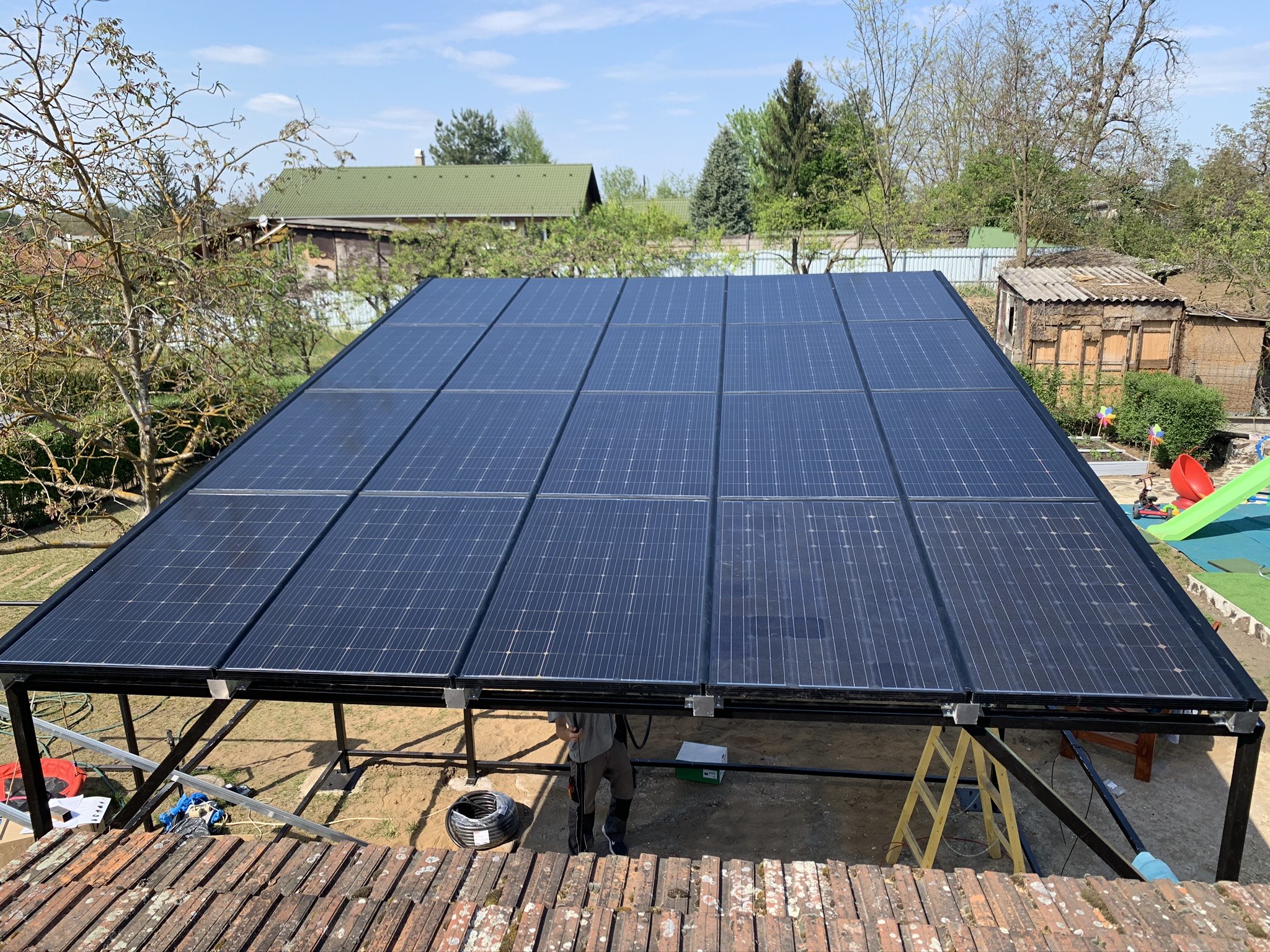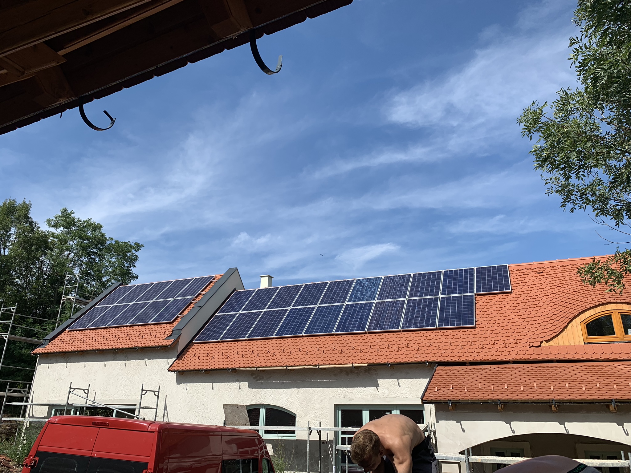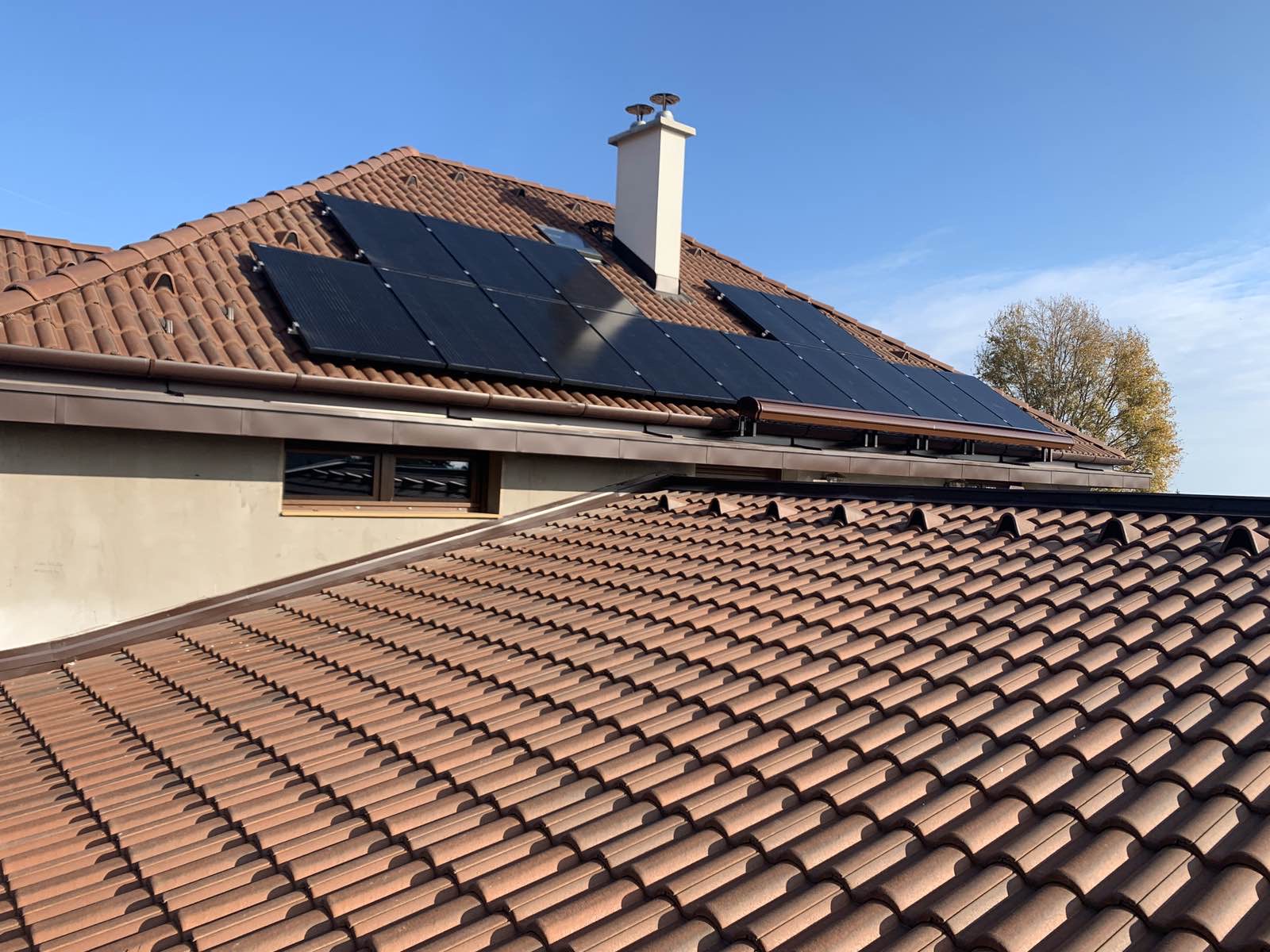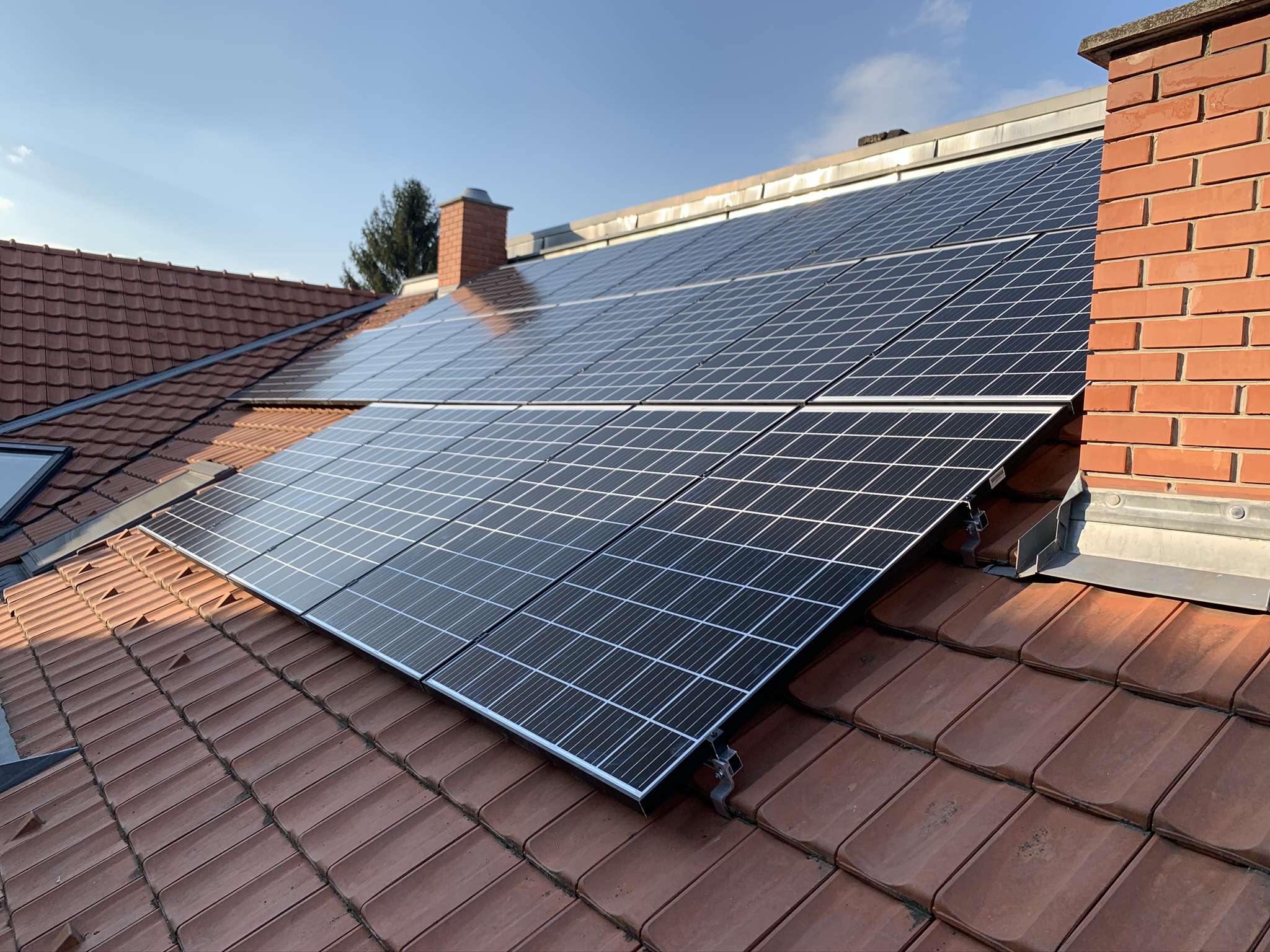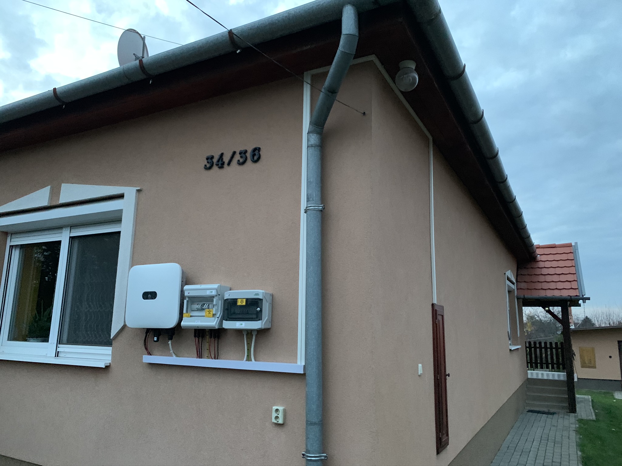 A családi házra telepített 56 paneles napelemes rendszer 20 kW inverterrel készült, modern, energiahatékony megoldást biztosítva a mindennapi fogyasztás fedezésére.
