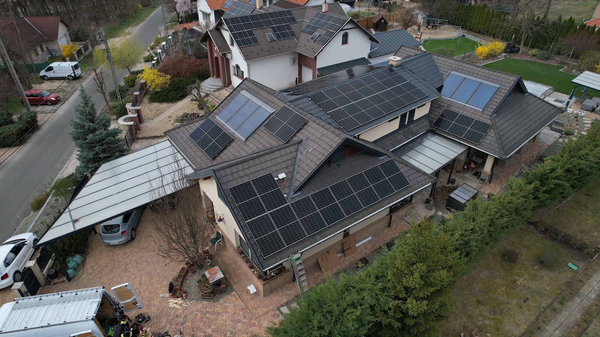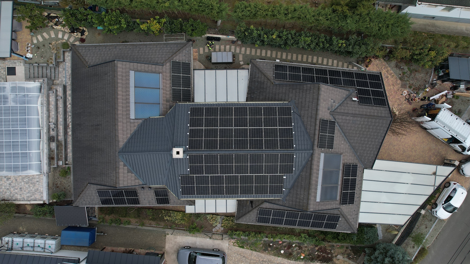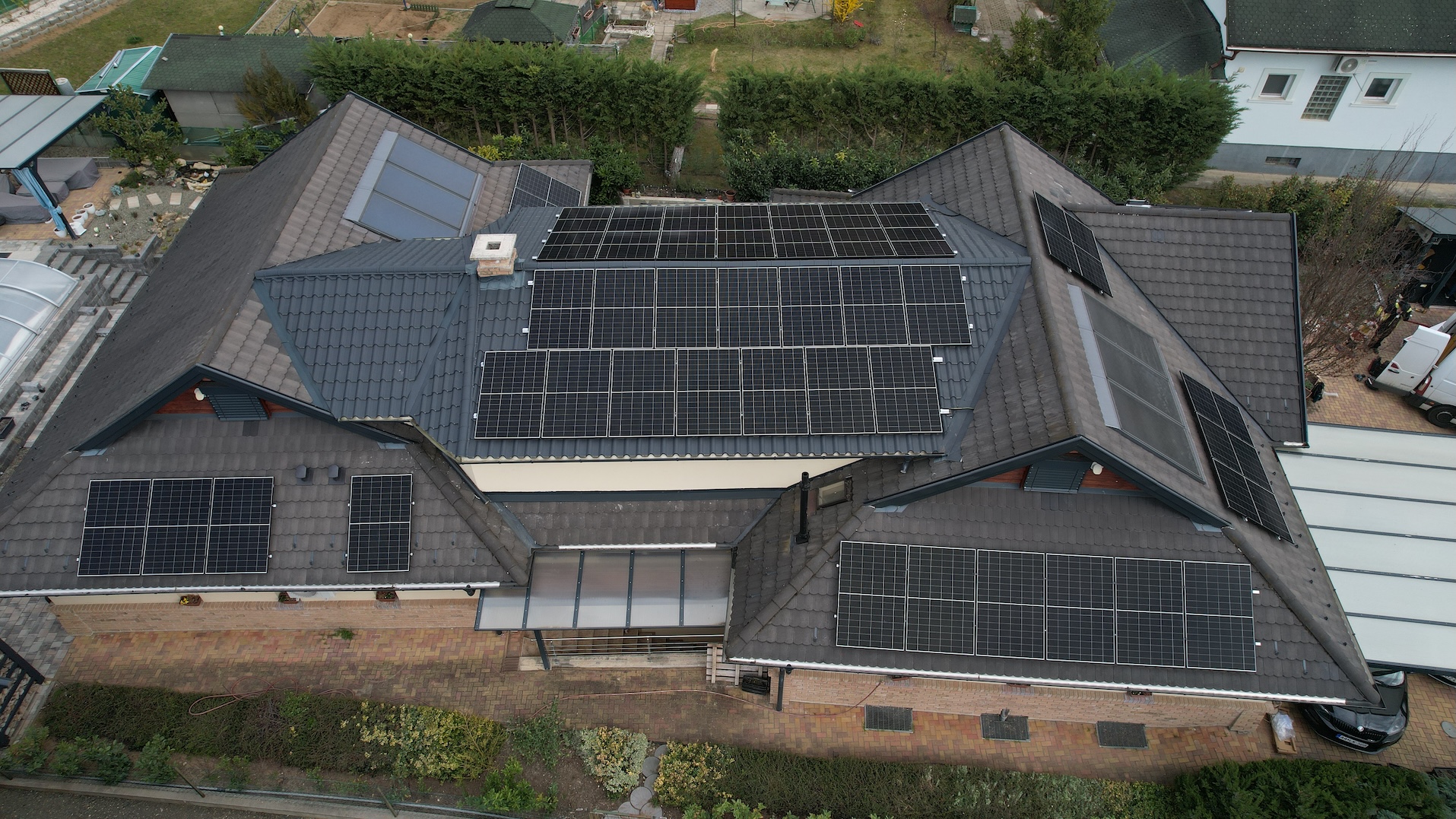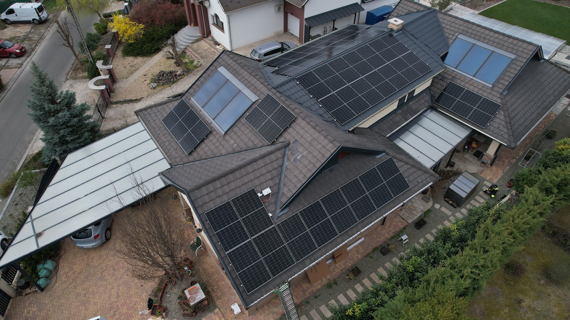 A családi házra telepített 56 paneles napelemes rendszer 20 kW inverterrel készült, modern, energiahatékony megoldást biztosítva a mindennapi fogyasztás fedezésére.