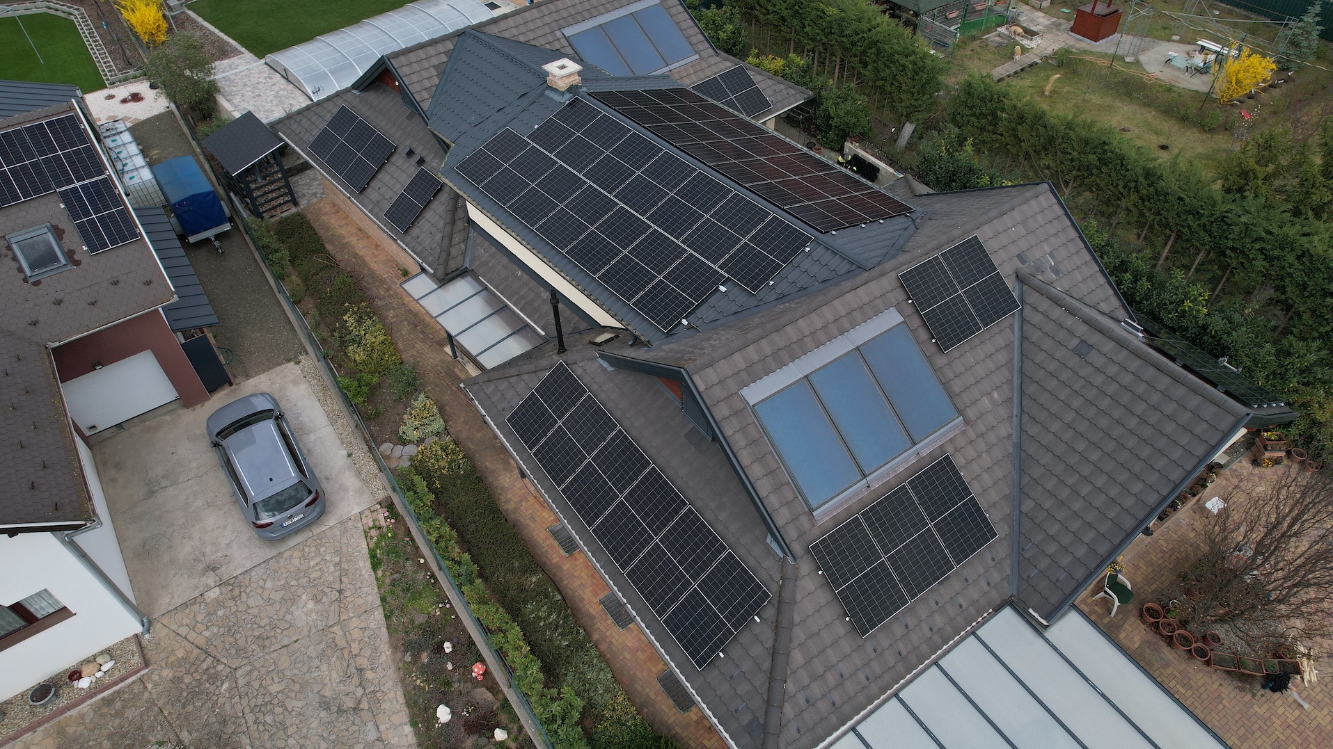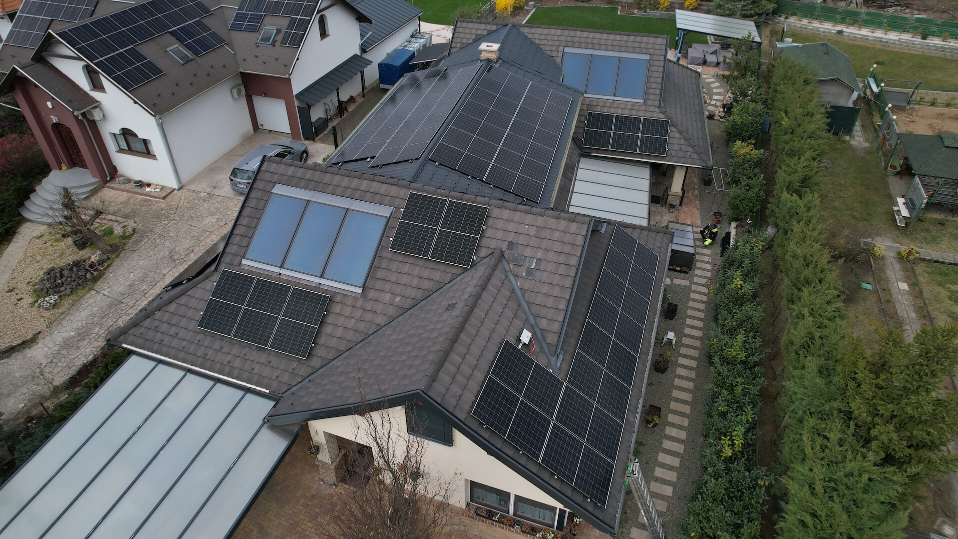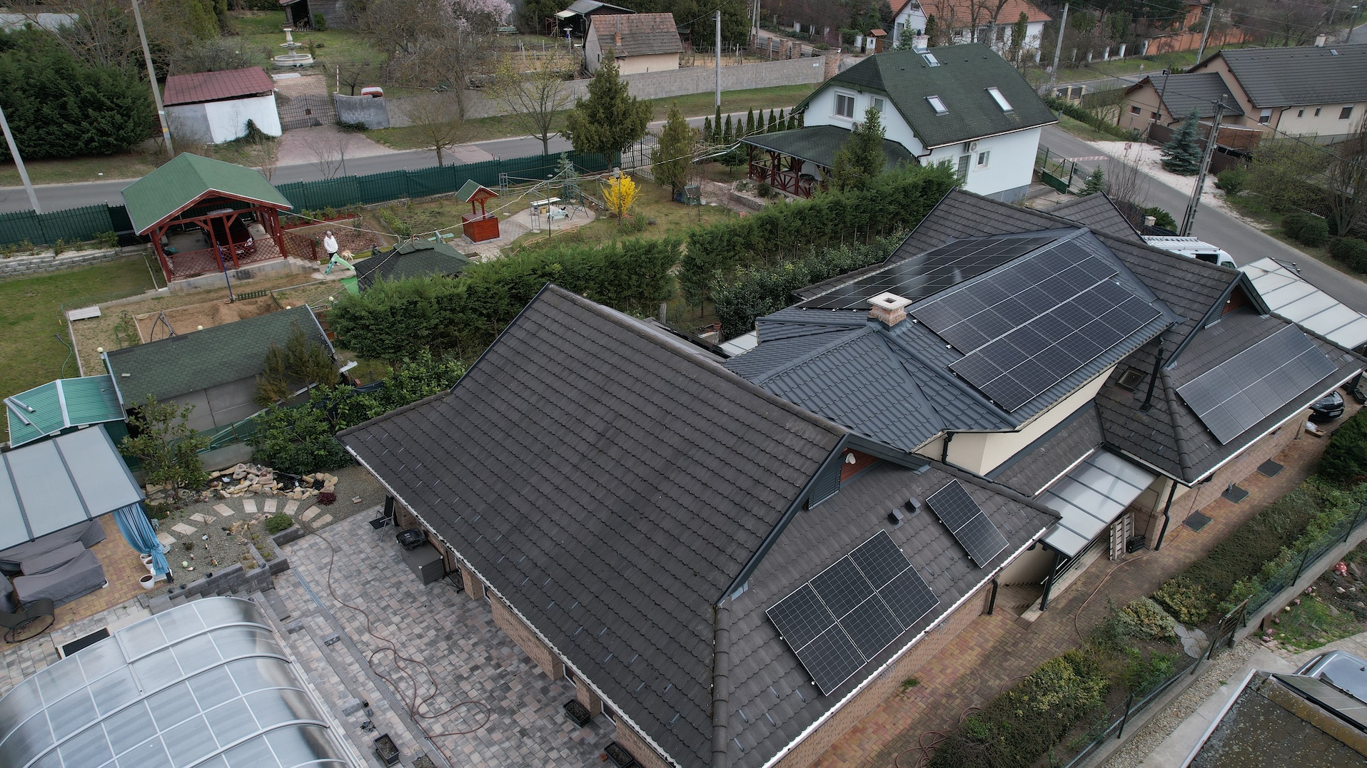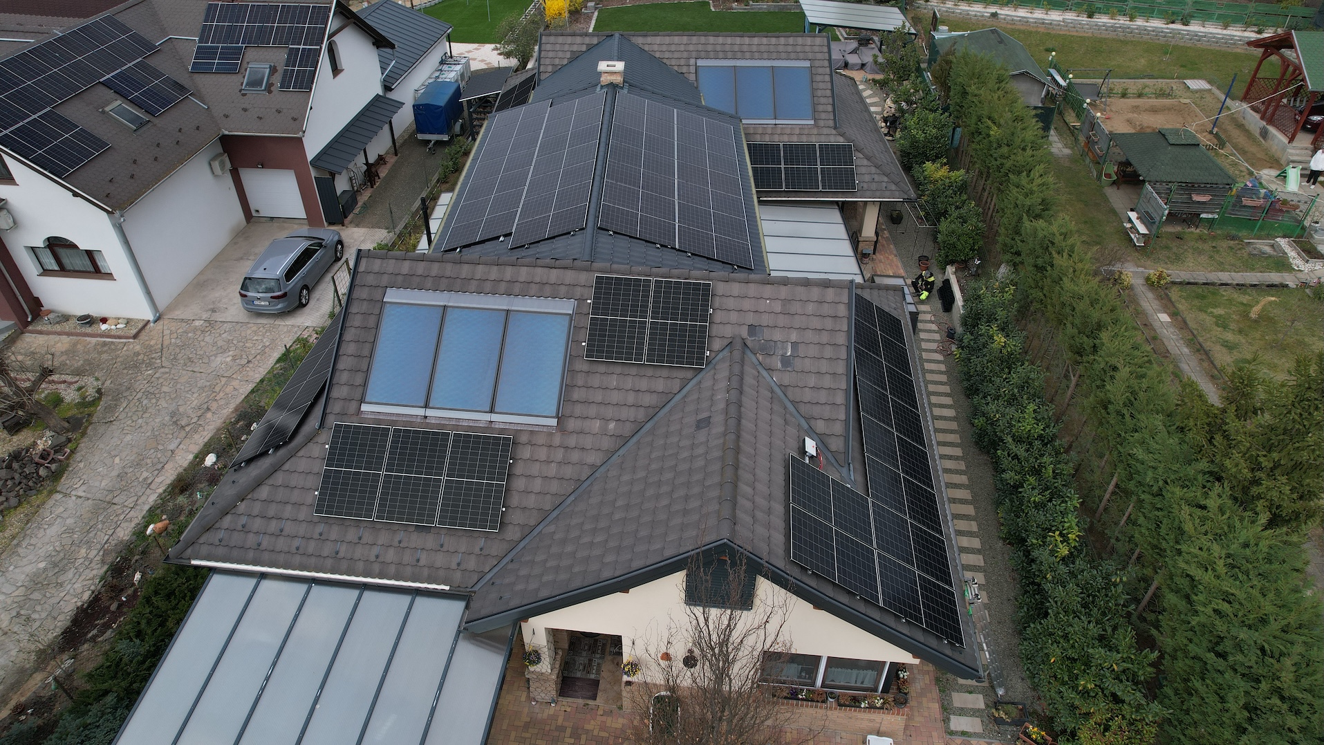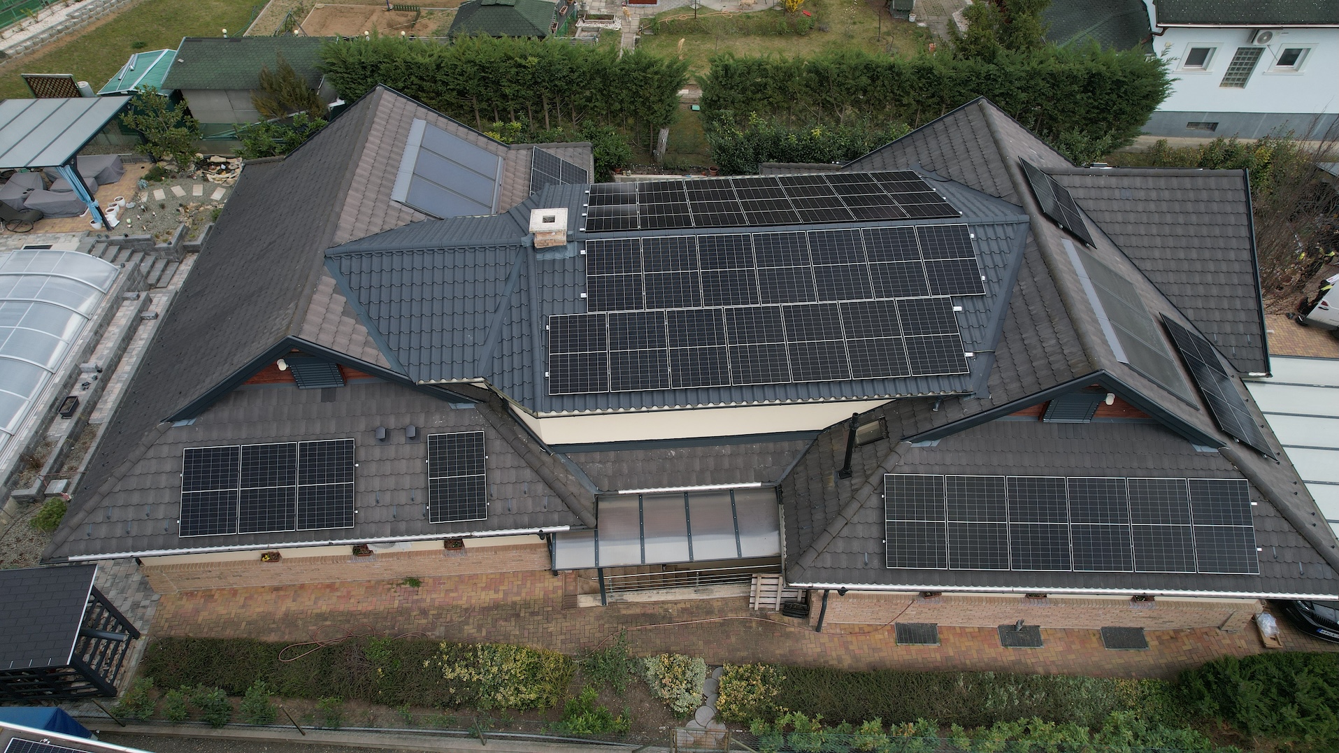 A családi házra telepített 56 paneles napelemes rendszer 20 kW inverterrel készült, modern, energiahatékony megoldást biztosítva a mindennapi fogyasztás fedezésére.